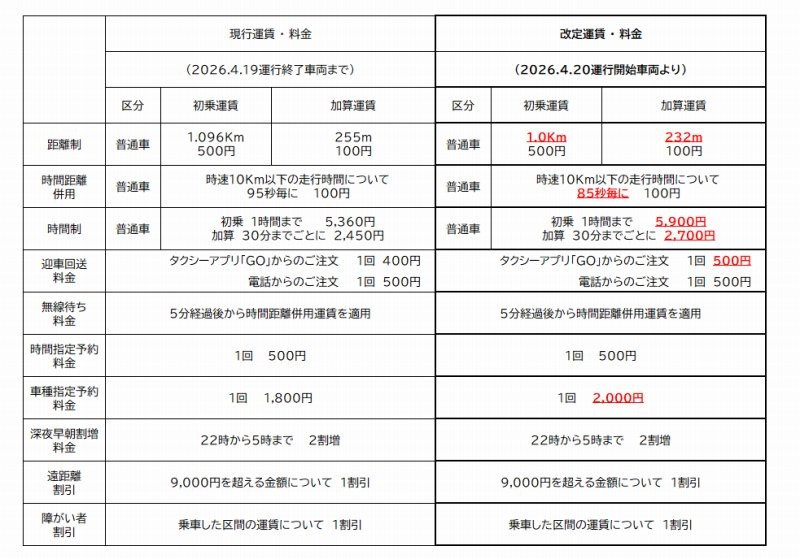これに伴い、弊社におきましても2026年4月20日(認可施行予定)の運行車両より、下記の通り新たなタクシー運賃・料金にて営業を行ってまいりますので、ご案内申し上げます。